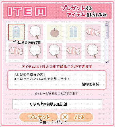 P.S:每天只可以送3次禮物,過了3次就要等待明天再送,記得喔!